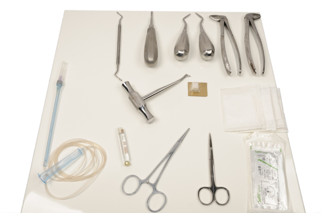 Rys. Zestaw do ekstrakcji zęba 36 w znieczuleniu the Wand oraz zestaw do szycia rany.